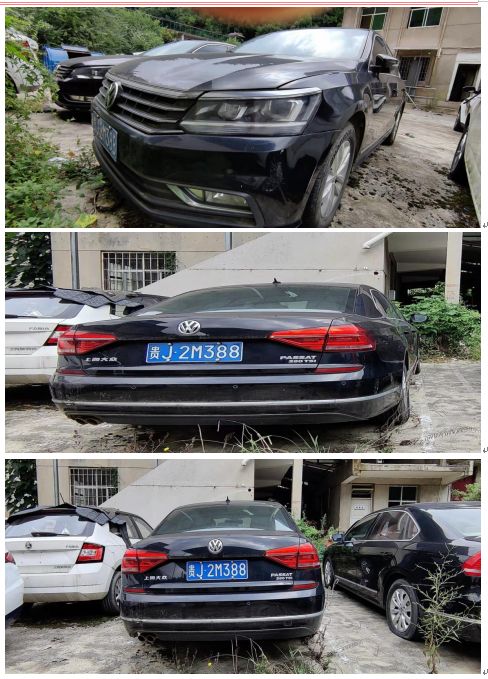 車輛原號牌為“貴J2M388”的大眾汽車牌SVW71410BL型帕薩特小型汽車,因停放時間較長,無法啟動,無法查看儀表數據,車輛外觀積灰較多, |