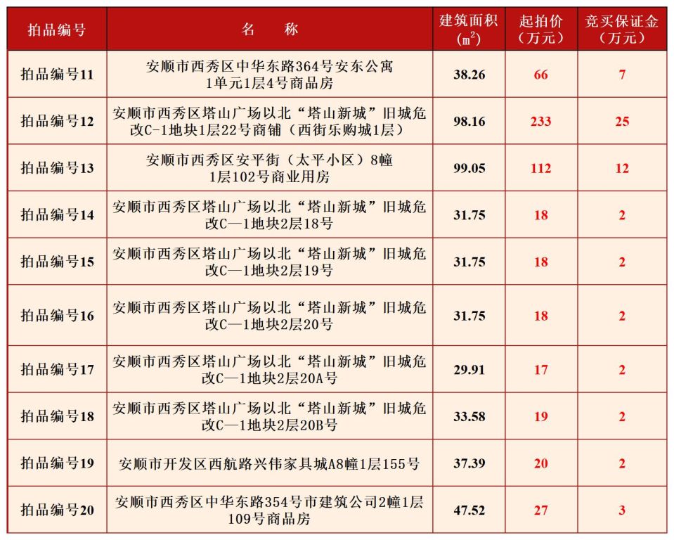 14、安順市西秀區塔山廣場以北“塔山新城”舊城危改C—1地塊2層18號、19號、20號,共計3處(建筑面積均為:31.75㎡);