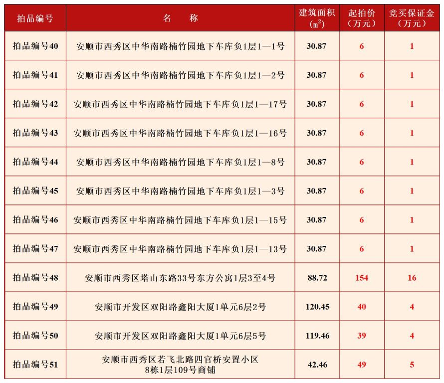 38、安順市西秀區中華南路楠竹園地下車庫負1層:1—1號、1—2號、1—17號、1—16號、1—8號、1—3號、1—15號、1—13號,共計8個(建筑面積均為:30.87㎡);