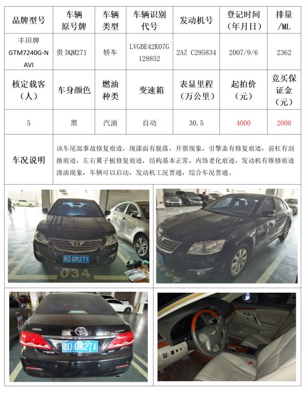 拍品編號3:豐田牌GTM7240G-NAVI轎車一輛