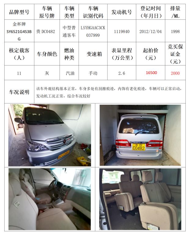 拍品編號11:金杯牌SY6521G4S3BG中型普通客車一輛