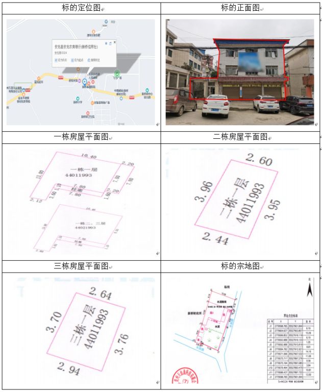 標的坐落于安龍縣新橋鎮新橋居委會,房屋總層數3層,其中1幢1-3層證載建筑面積:312.26㎡,實測建筑面積:338.52㎡,2幢1層證載建筑面積:10.81㎡,實測建筑面積:9㎡,3幢1層證載建筑面積:9.72㎡,實測建筑面積:10.42㎡,房屋產權證號:安房權證新橋鎮字第00003462號,設計用途分別為辦公住宅、其它,混合結構;土地使用權證號:安國用(2014)第20號,證載土地使用權面積:443.24㎡,實測土地使用權面積443.24㎡,地類(用途)金融用地,使用權類型為出讓,終止日期為2054年11月22日止。