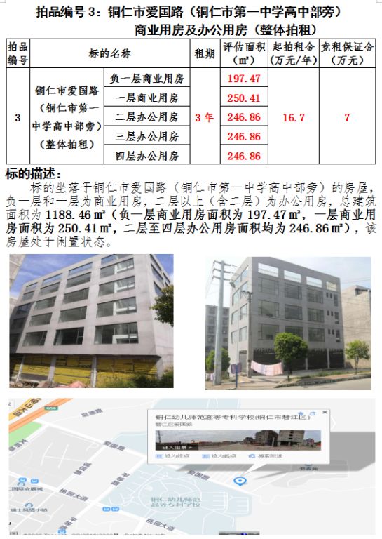 三、銅仁市愛國路(銅仁市第一中學高中部旁)負一層至四層商業(yè)用房及辦公用房3年租賃權(總建筑面積:1188.46㎡);