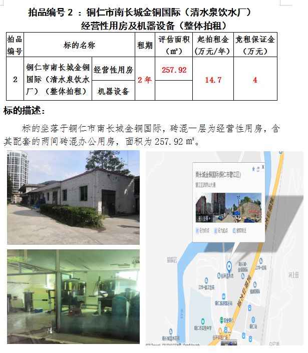 二、銅仁市南長城金銅國際(清水泉飲水廠)經營性用房及機器設備2年租賃權(建筑面積:257.92㎡);