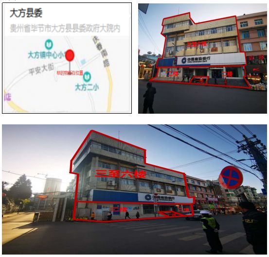 標的物位于畢節市大方縣大方鎮南街1層至6層,總建筑面積:1479.43㎡,其中:1層建筑面積為222.97㎡,2層建筑面積為284.43㎡,3至6層建筑面積為972.03㎡,房屋所有權證號:方房權證2005字第370609722號;用地面積:267.84㎡;建筑結構:混合結構;用途:辦公用地;總樓層:共6層;使用權類型:出讓;土地終止日期:2035年8月。