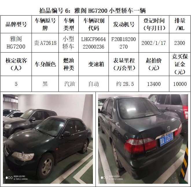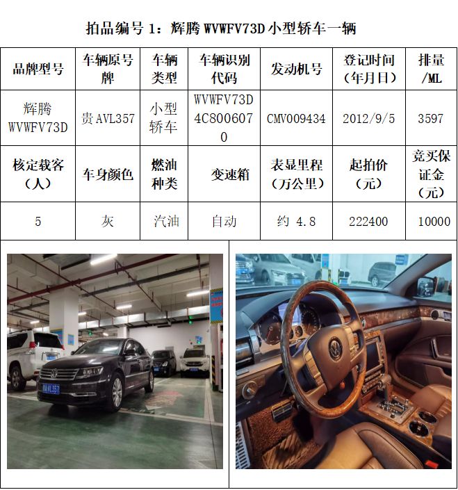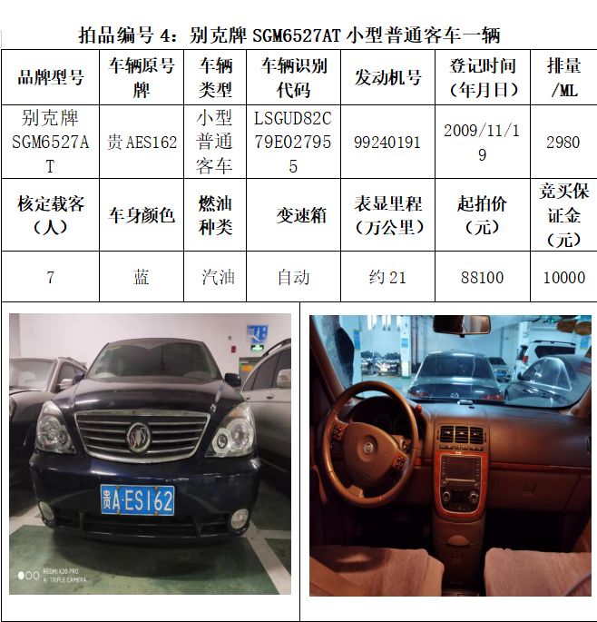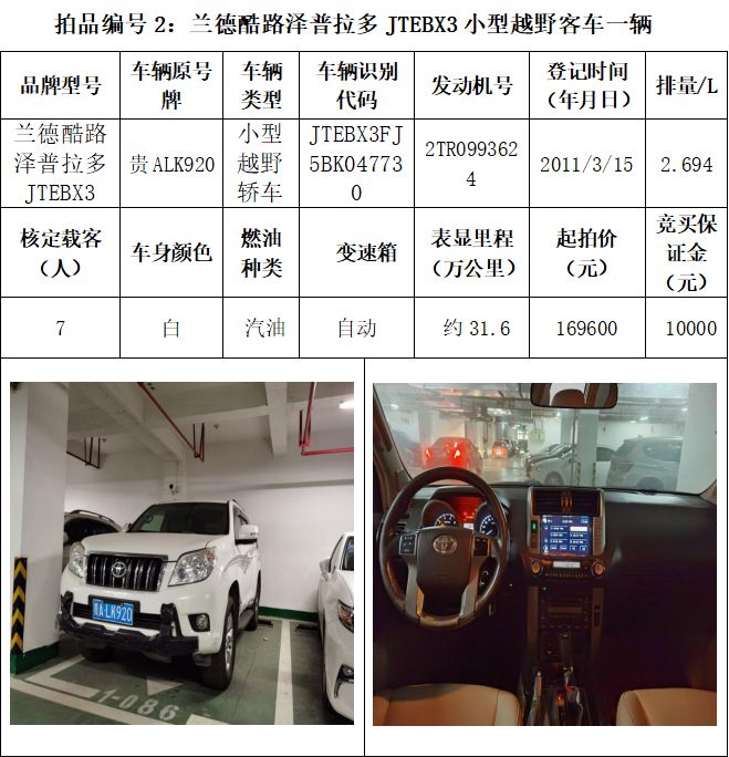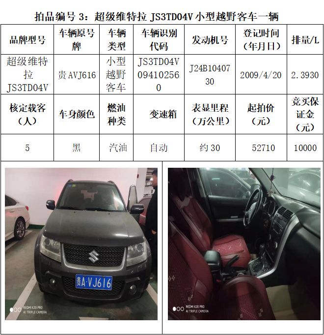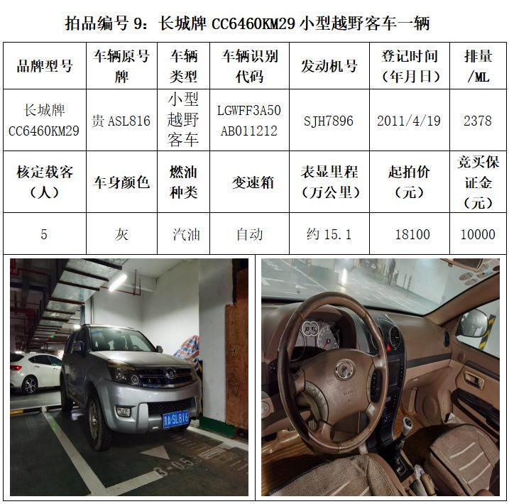 受委托,本公司定于2021年3月26日(星期五)下午14:30時,在貴陽市中華南路20號新大陸數碼廣場10樓D座拍賣廳公開拍賣以下車輛:普拉多越野車1輛、超級維特拉越野車1輛、別克商務旅行車1輛、輝騰轎車1輛、途勝越野車1輛、雅閣轎車2輛、奧迪轎車1輛,長城牌小型越野客車1輛,共計9輛車。
