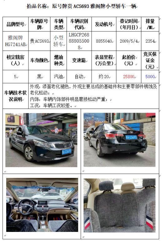 貴州春秋拍賣 奧迪牌、雅閣牌等3輛機動車拍賣公告
