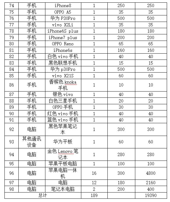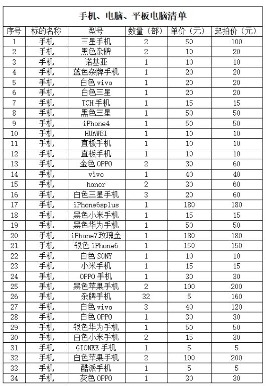 該批標的包含各類品牌手機155部、電腦33臺、平板電腦1臺。(詳見后附手機、電腦、平板電腦清單),該批手機、電腦、平板電腦因長期閑置,存在電池無電,無法開機等影響使用的情況。