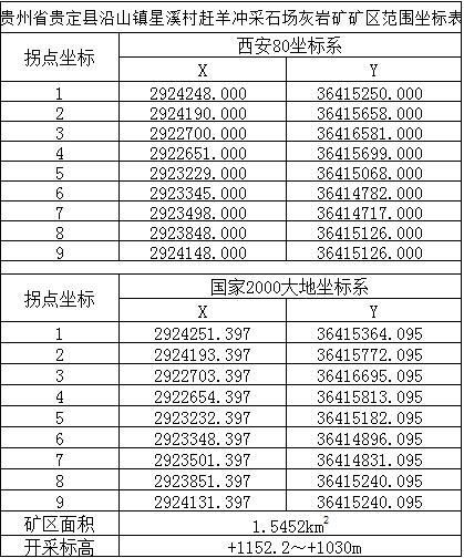 拍賣采礦權名稱貴定縣沿山鎮星溪村趕羊沖采石場灰巖礦采礦權,根據國土部門批準劃定的礦區范圍,礦區面積為1.5452平方千米,開采標高+1152.2~+1030米,礦區拐點坐標如下: