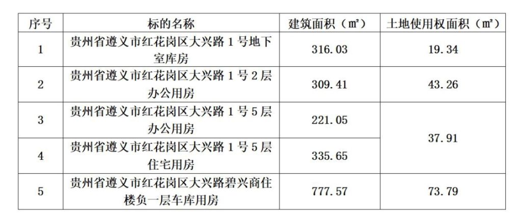 1、貴州省遵義市紅花崗區大興路1號地下室庫房(總建筑面積:316.03㎡);貴州省遵義市紅花崗區大興路1號2層辦公用房(總建筑面積:309.41㎡);貴州省遵義市紅花崗區大興路1號5層辦公用房(總建筑面積:221.05㎡);貴州省遵義市紅花崗區大興路1號5層住宅用房(總建筑面積:335.65㎡);貴州省遵義市紅花崗區大興路碧興商住樓負一層車庫用房(總建筑面積:777.57㎡)。(整體拍賣)