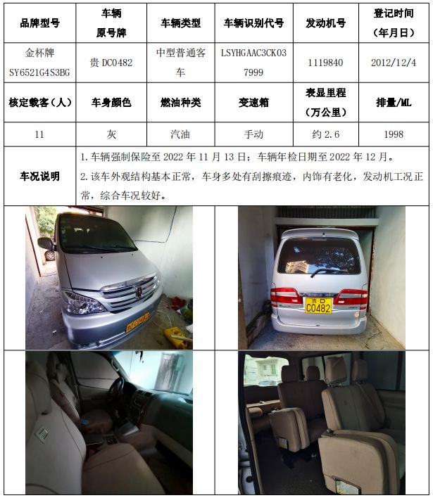 拍品編號19:三菱牌CFA2031H小型越野客車一輛、金龍牌KLQ6109E3大型普通客車一輛、江鈴全順牌JX6466DF-M小型普通客車一輛、東方日產牌DFL6460VFC1小型普通客車一輛