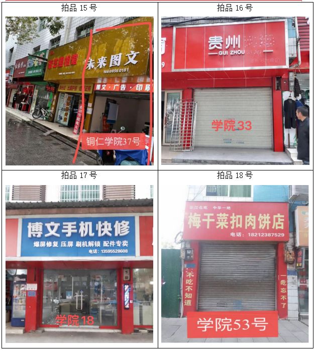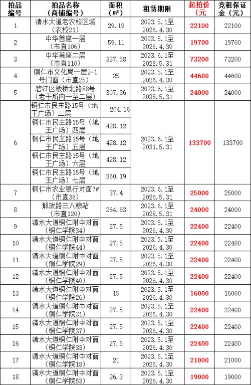拍品14號至16號標的:位于清水大道銅仁附中對面,面積均為:27.5㎡,租賃期均為3年(2023.5.1至2026.4.30),附近有車站、醫院、銀行、酒店、超市、學校等,交通便利,人流量大。