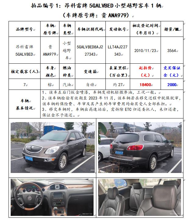 1、昂科雷牌5GALVBED小型越野客車1輛(車牌原號牌:貴ANA979);