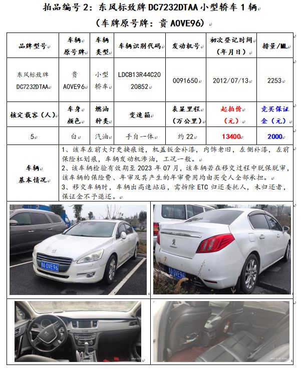 2、東風標致牌DC7232DTAA小型轎車1輛(車牌原號牌:貴A0VE96);