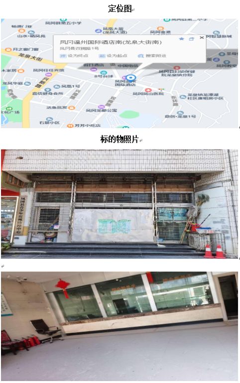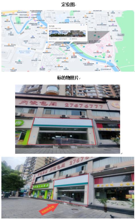 1、標的坐落于遵義市鳳岡縣龍泉鎮環南路鑫發龍鳳花園,房屋地上共6層,標的所在層數位于第1層,建筑面積:82.96㎡,室內凈層高約3米,建筑結構:混合結構,規劃用途為商業,分攤土地使用權面積:12.13㎡,地類(用途):商服用地,使用權類型:出讓;