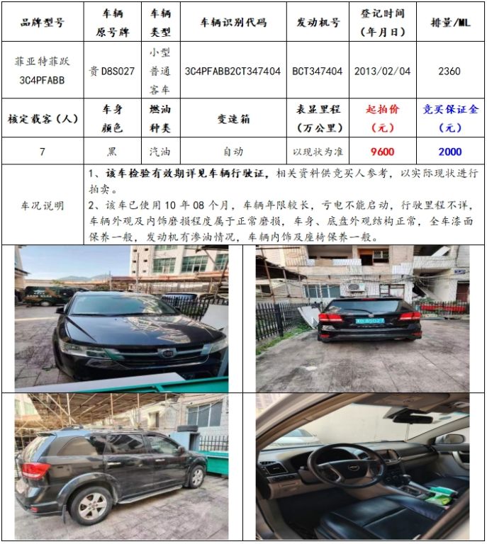 拍品編號2:菲亞特3C4PFABB小型普通客車一輛(車輛原號牌:貴D8S027);