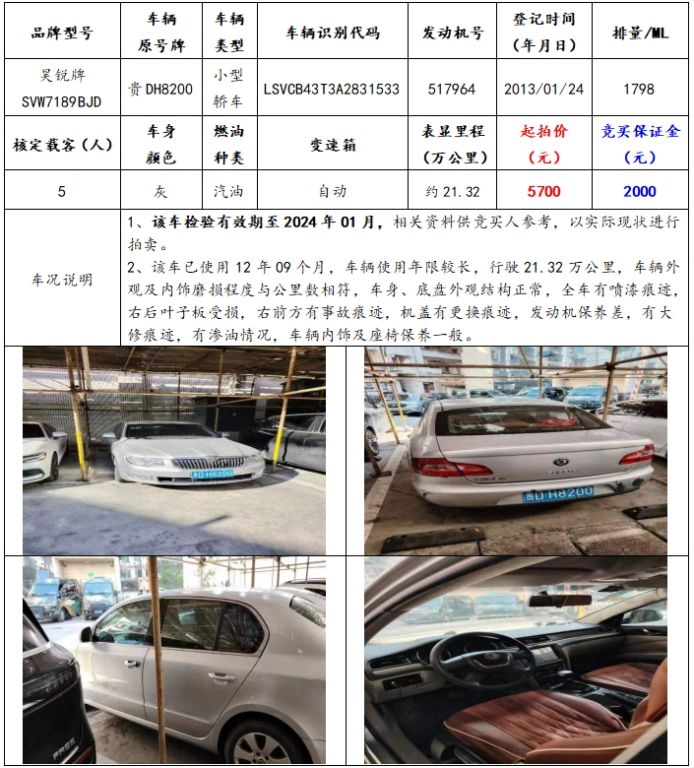 拍品編號5:昊銳牌SVW7189BJD小型轎車一輛(車輛原號牌:貴DH8200)。