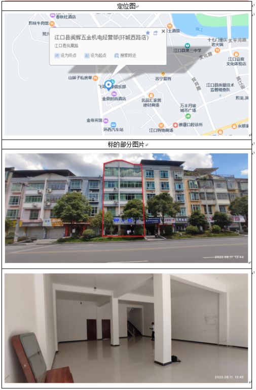 1、標的坐落于江口縣雙江鎮龍井廣場江源山水20棟1層2號商鋪。標的總間數為1間,建筑面積:744.3㎡(商業:744.3㎡)一樓商業門面,一般裝修,水電設施齊全。