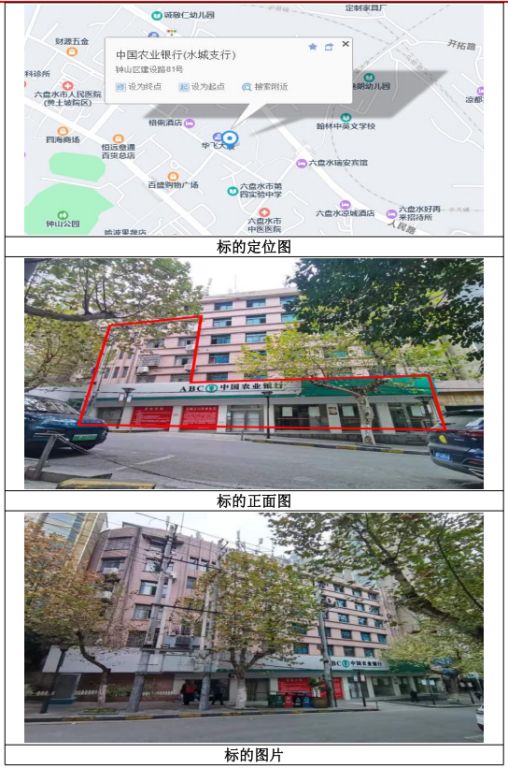 1、標的位于六盤水市鐘山區建設東路20號,建筑面積為1233.75㎡,混合結構,總樓層數為7層,所在樓層數為1至6層,設計用途為商業。