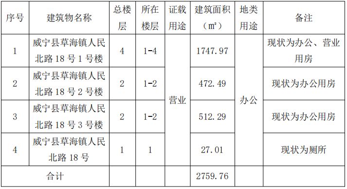 標的坐落于威寧縣草海鎮人民北路18號稱為1號樓、2號樓和3號樓的三項房屋,房屋建筑面積為:2759.76㎡,混合結構,房屋總層數為4層,拍賣標的所在層數為1-4層,產權證號:威房權證草海鎮字第00007730號,設計用途為營業。土地證號:威國用(2009)第133號,地類(用途):辦公用地,使用權類型:作價出資,使用權面積:1854.70㎡。