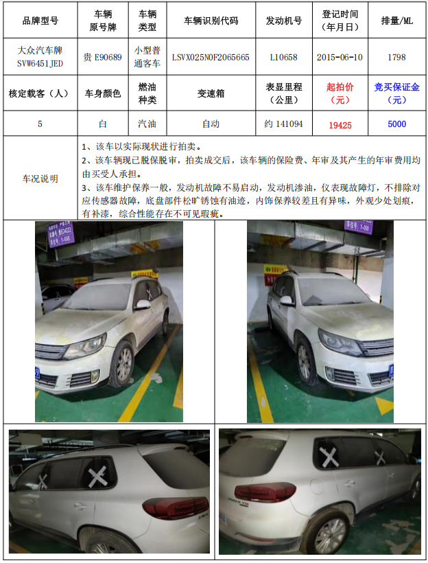 拍品編號7:大眾汽車牌SVW6451JED小型普通客車1輛(車輛原號牌:貴E90689)