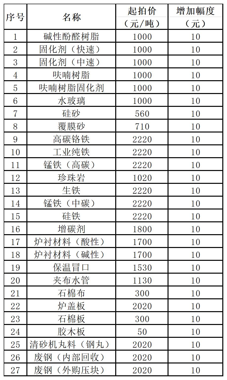 該標的為整體拍賣,以第1項堿性酚醛樹脂起拍單價1000元/噸進行競價,采取增價方式競拍,每次每噸加價10元,上不封頂;堿性酚醛樹脂每增加10元/噸,第2-27項廢舊原材料同步增加10元/噸。