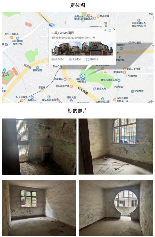 標的坐落于白云區白云南路50號1單元1層2號,房屋總層數為4層,拍賣標的所在層數為1層,產權證編號:黔(2025)白云區不動產權第0005922號,權利類型:國有建設用地使用權/房屋所有權,權利性質:劃撥/自建房,用途:城鎮住宅用地/成套住宅,建筑面積:54.5㎡,房屋結構:混合結構。