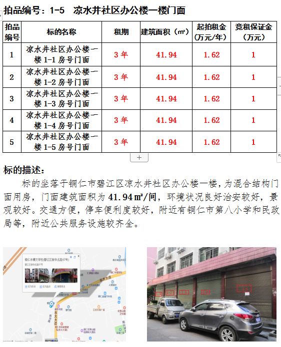 1、涼水井社區(qū)辦公樓一樓門面5間1-1、1-2、 1-3、 1-4、 1-5)3年租賃權(quán)(建筑面積:41.94㎡/間);起拍租金單價(每間):1.62萬元/年;競租保證金(每間):1萬元;