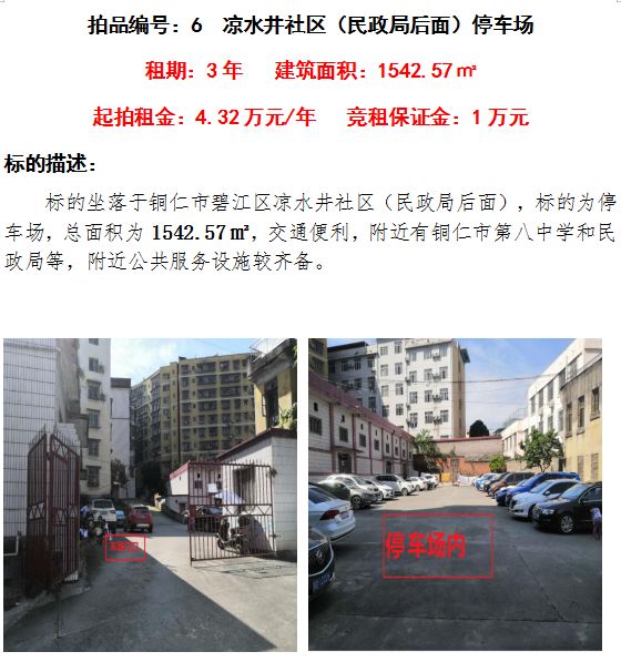 2、涼水井社區(qū)(民政局后面)停車場3年租賃權(quán)(建筑面積:1542.57㎡);起拍租金:4.32萬元/年;競租保證金:1萬元;