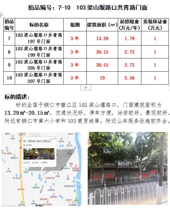 3、103梁山堰路口門面四間3年租賃權(quán)(建筑面積:13.29㎡-20.15㎡);起拍租金單價:1.79萬元/年-2.72萬元/年;競租保證金:1萬元;