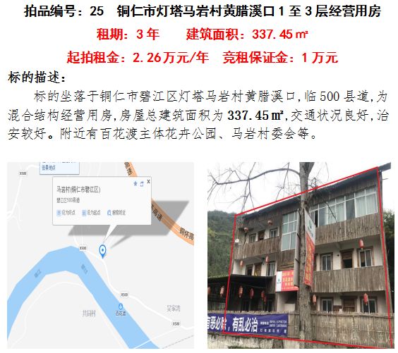 6、銅仁市碧江區(qū)燈塔馬巖村黃臘溪口1-3層經(jīng)營房3年租賃權(quán)(建筑面積:337.45㎡);起拍租金單價:2.26萬元/年;競租保證金:1萬元;