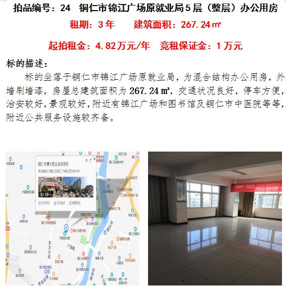 5、銅仁市錦江廣場原就業(yè)局第五樓辦公用房3年租賃權(quán)(建筑面積:267.24㎡);起拍租金單價:4.82萬元/年;競租保證金:1萬元;