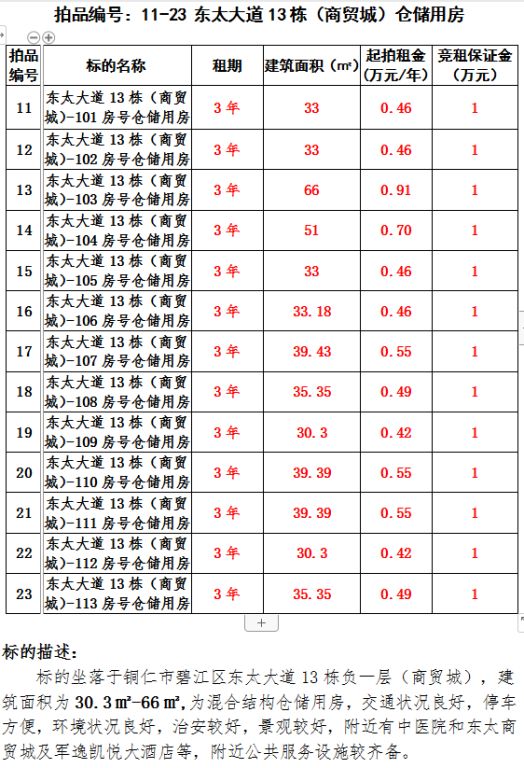 4、東太大道13棟(商貿(mào)城)倉儲(13間)3年租賃權(quán)(建筑面積30.3㎡-66㎡/間);起拍租金單價(每間):0.42萬元/年-0.91萬元/年;競租保證金(每間):1萬元;