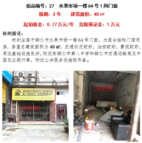 8、銅仁市水果市場一樓64號門面3年租賃權(quán)(建筑面積:40㎡);起拍租金單價:0.77萬元/年;競租保證金:1萬元;