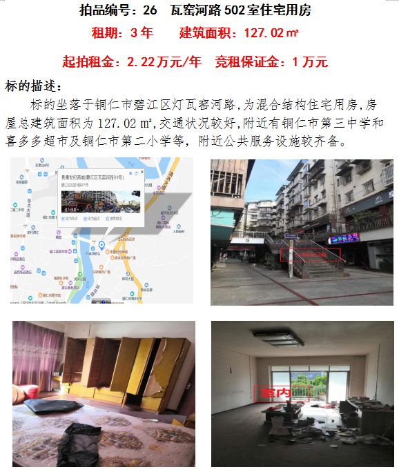 7、銅仁市碧江區(qū)瓦窯河路502室住宅用房3年租賃權(quán)(建筑面積:127.02㎡);起拍租金單價:2.22萬元/年;競租保證金:1萬元;