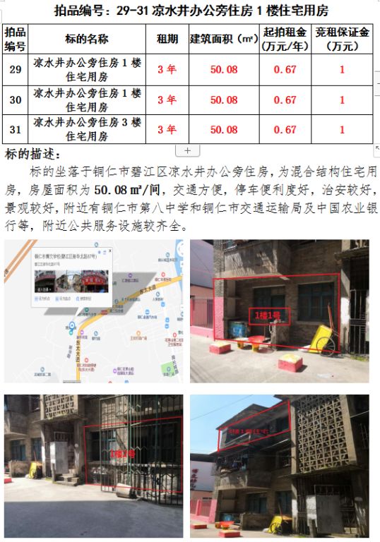 11、銅仁市碧江區(qū)涼水井辦公旁住宅用房三間3年租賃權(quán)(建筑面積:50.08㎡/間);起拍租金單價(間):0.67萬元/年;競租保證金:1萬元;