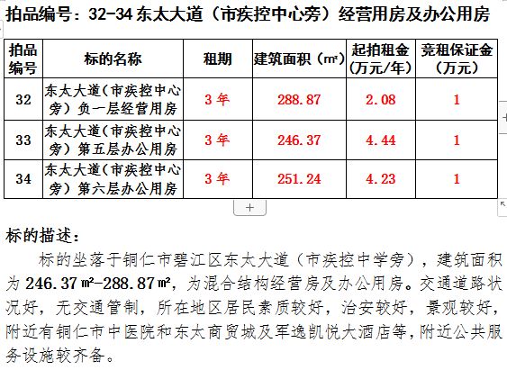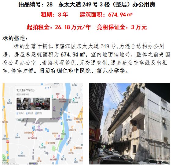10、銅仁市碧江區(qū)東太大道249號辦公室3年租賃權(quán)(建筑面積:674.94㎡);起拍租金單價:26.18萬元/年;競租保證金:3萬元;